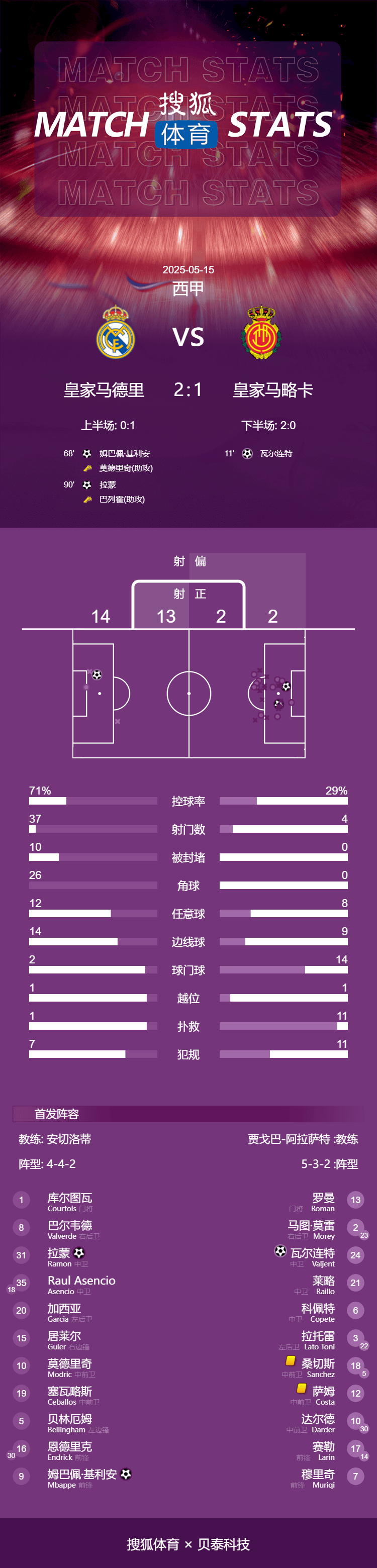 第84分钟,巴尔韦德禁区外右脚抽射,马略卡门将将球扑出皇冠信用網出租 。第85分钟,居莱尔传球,贝林厄姆插上小角度推射被马略卡门将用脚挡出。