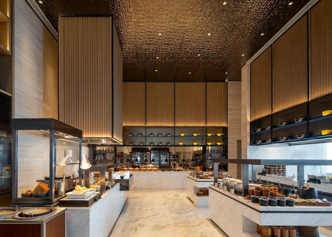 全日餐厅以开放式厨房和自助餐台为特色,提供了一个充满活力的餐饮体验皇冠皇冠平台。墙面造型和陈列展示柜巧妙地结合,既展示了餐厅的多样性,也营造出一种温馨的用餐氛围。在这里,无论是商务洽谈还是家庭聚餐,都能享受到美味与舒适的双重体验。
