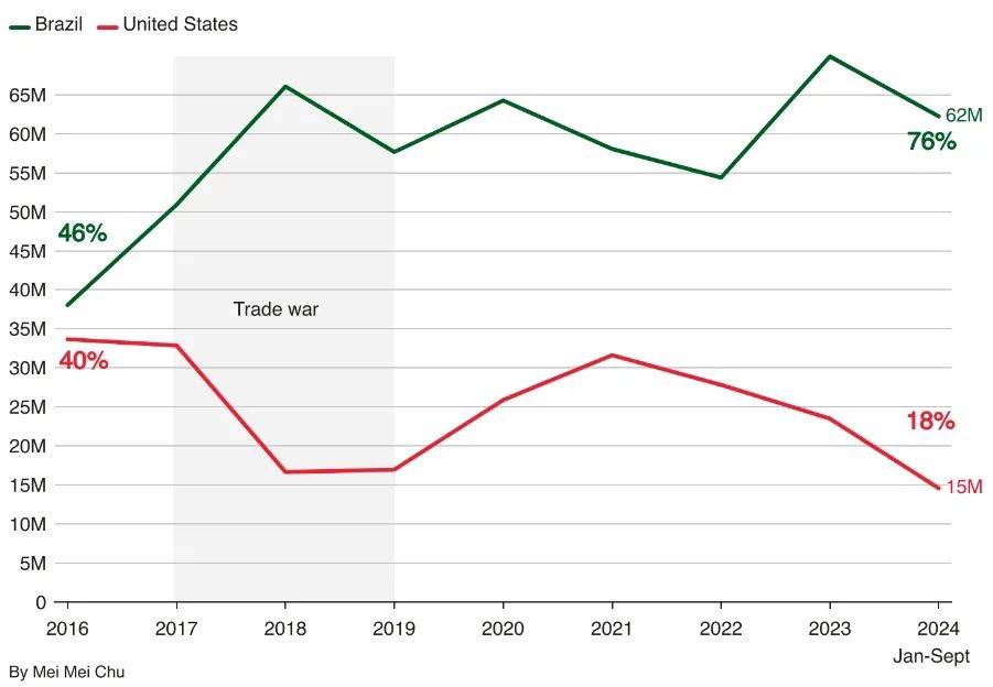 自2018年以来,中国一直在实现供应源多元化,以减少对美国农产品的依赖皇冠信用網代理流程。红色代表美国,绿色代表巴西。 路透社制图
