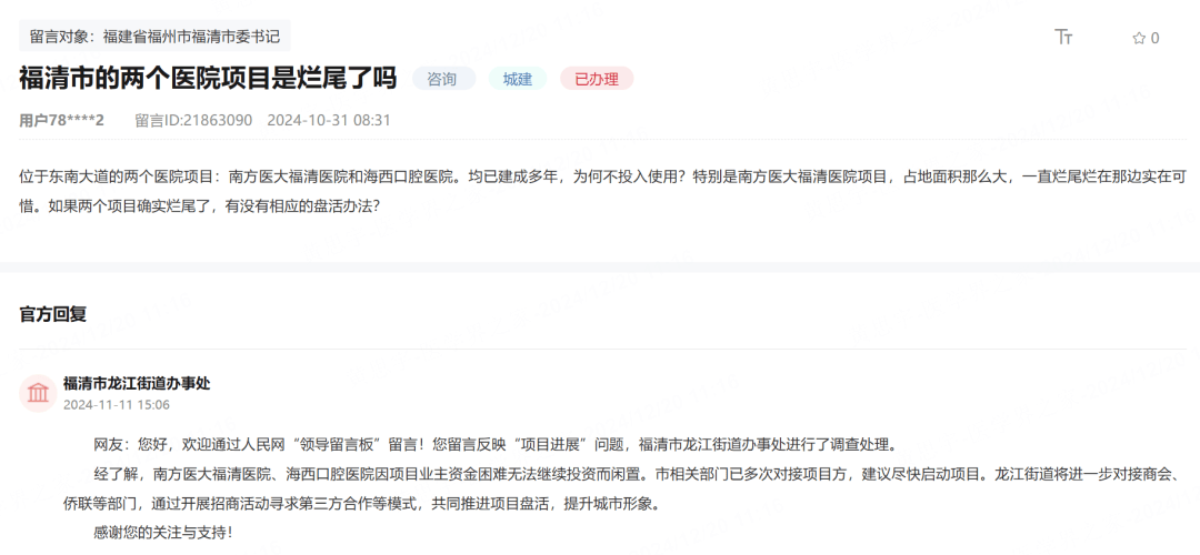 在“人民网”领导留言板上,福清当地政府答复网友称,南方医大福清医院、海西口腔医院因项目业主资金困难无法继续投资而闲置,市相关部门已多次对接项目方,建议尽快启动项目正版皇冠信用网开户。