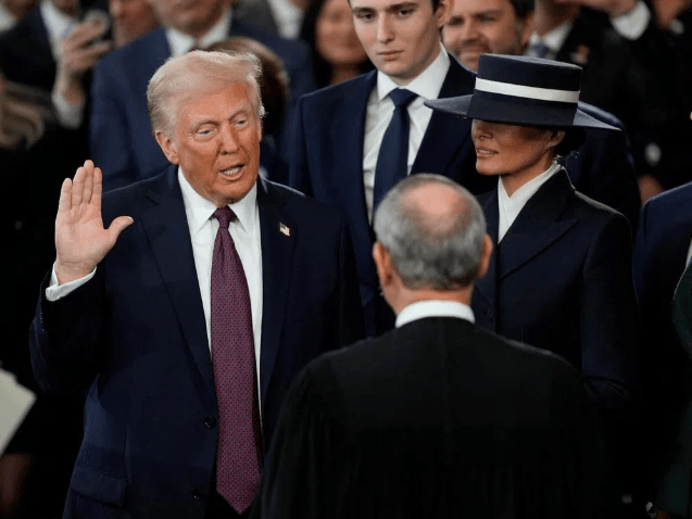 美国总统特朗普在华盛顿美国国会大厦圆形大厅举行的就职典礼上发表讲话皇冠代理。(图源:美联社)