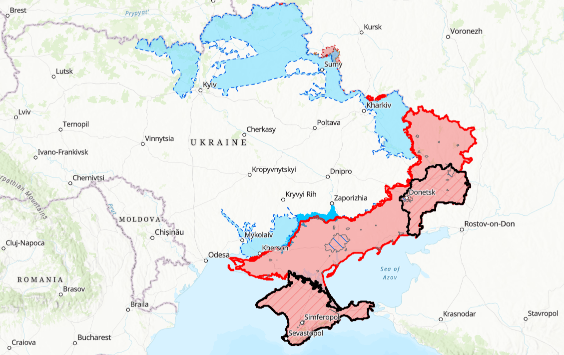 截至2024年底,俄罗斯几乎控制了卢甘斯克州全境,控制了顿涅茨克约60%的领土,控制了扎波罗热和赫尔松超过70%的领土马里-以色列。根据华盛顿特区战争研究所 (ISW) 收集的地理定位证据,俄罗斯军队在 2024 年占领了 4168 平方公里的土地。
