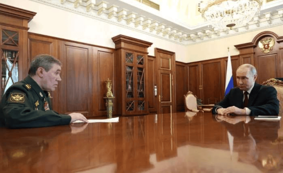 4月19日,俄罗斯武装力量总参谋长格拉西莫夫在克里姆林宫向俄罗斯总统普京汇报战况信用网皇冠申请注册 。(图源:路透)