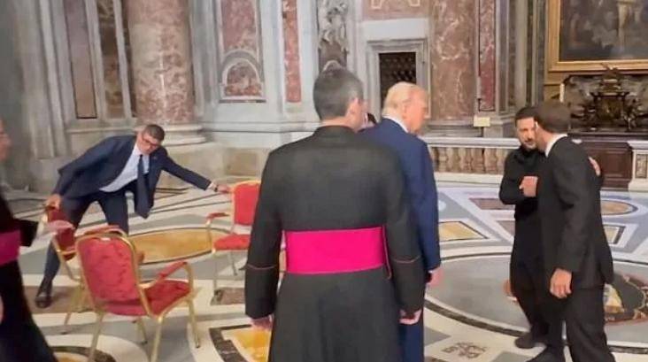 当地时间26日,法国总统马克龙(右)与美国总统特朗普、乌克兰总统泽连斯基会面,旁边工作人员在整理座椅皇冠信用网会员申请 。图源:英媒 视频截图