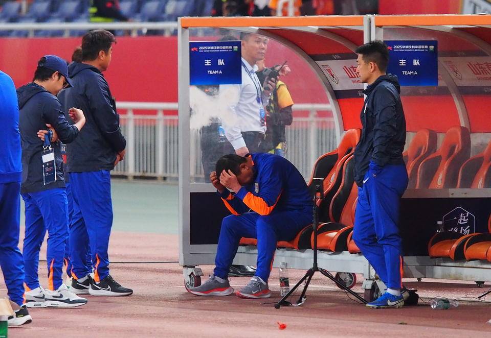 崔康熙抱头坐在教练席上,迟迟不愿离场皇冠信用平台出租出售 。齐鲁晚报·齐鲁壹点记者 周青先 摄