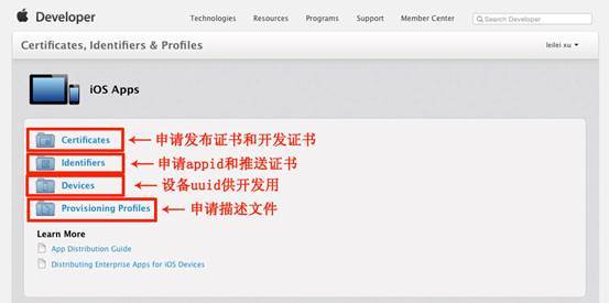 6、依次申请发布证书皇冠信用网账号申请,appid,推送证书(可选),设备udid(注册Devices用于设备调试【测试用】),描述文件