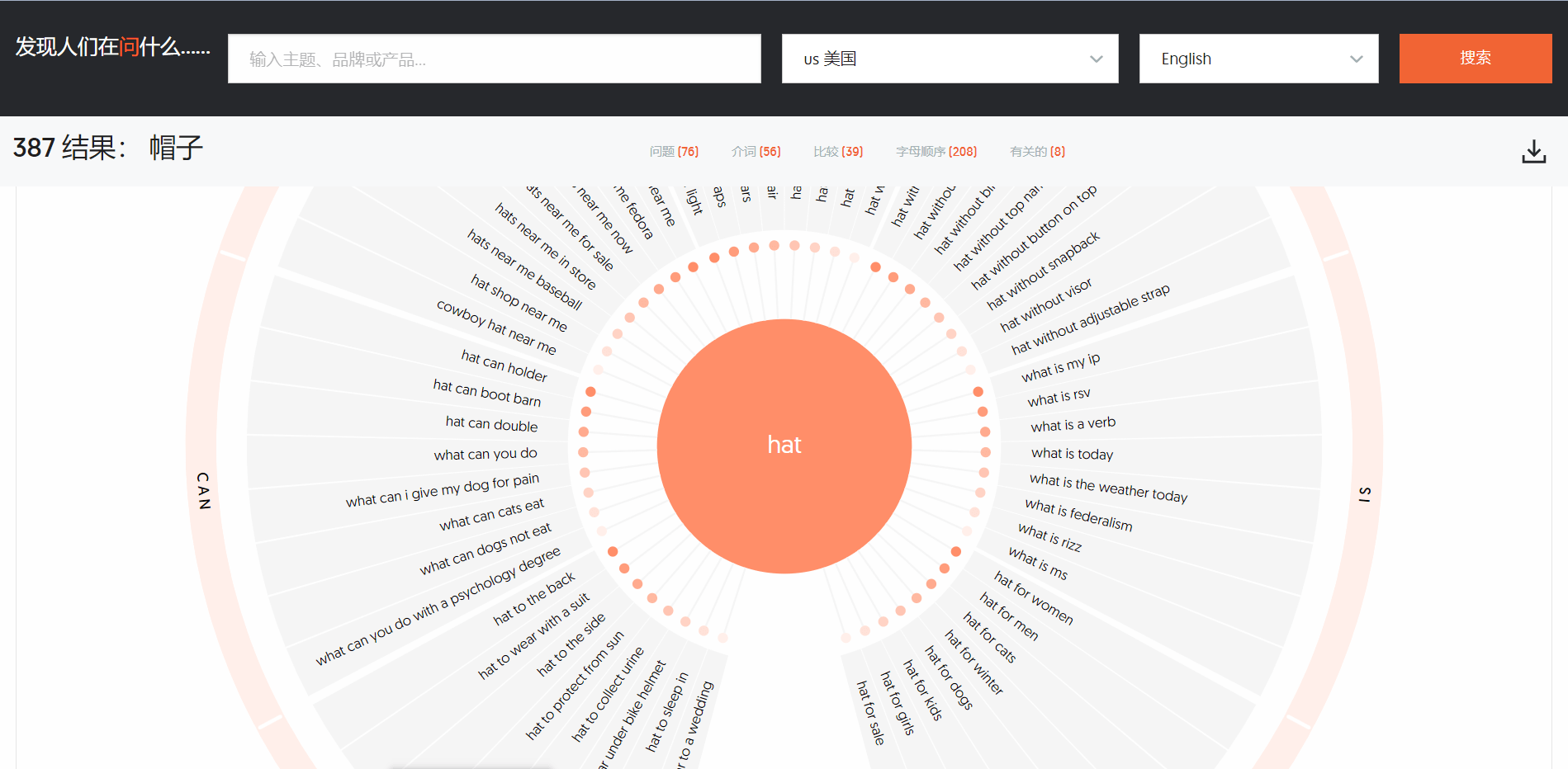 如下图所示,我们输入一个产品词“hat”,网站会把全部387个关于帽子的长尾关键词、常提问的问题和品牌词显示出来,十分给力介绍个皇冠信用网网址。