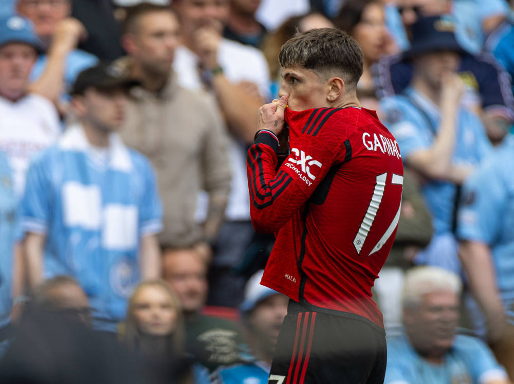 5月25日,曼彻斯特联队球员加纳乔庆祝进球英格兰足总杯。新华社发
